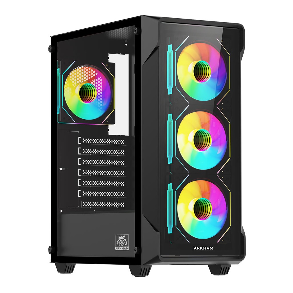El Gabinete Arkham Cancri presenta un diseño sofisticado en color negro, que se adapta a cualquier setup gaming. Su panel frontal, que combina plástico y vidrio templado, no solo le da un aspecto premium, sino que también permite una entrada de aire adecuada a la vez que exhibe los ventiladores ARGB frontales. Además, el panel lateral izquierdo de vidrio templado ofrece una vista panorámica de tu hardware interno y la vibrante iluminación ARGB de tus componentes. Asimismo, una práctica rejilla anti-polvo en el panel superior ayuda a mantener el interior limpio y el flujo de aire sin obstrucciones.